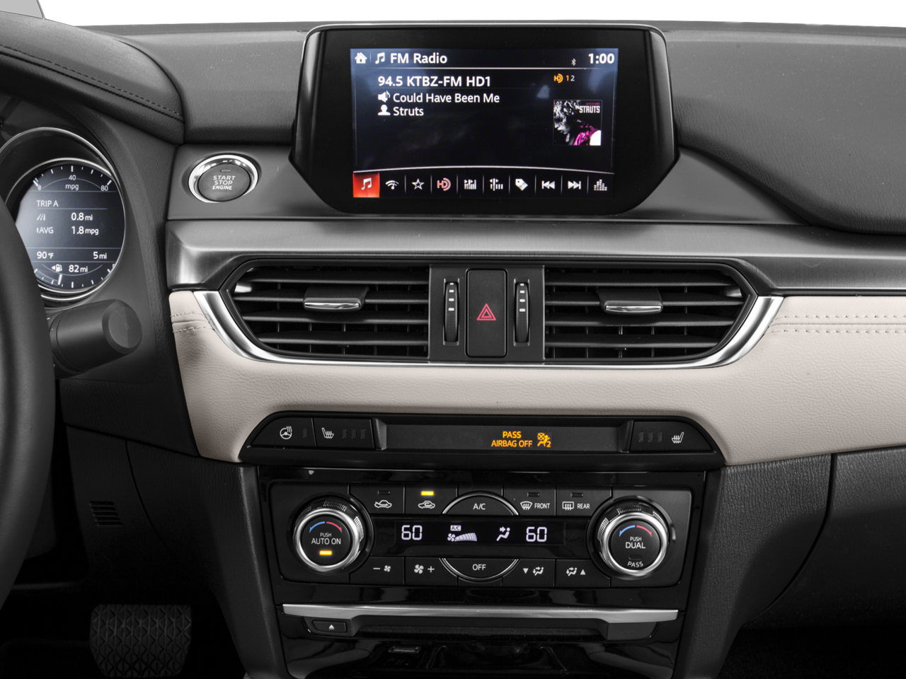- Radio: AM/FM/CD/MP3/AUX BOSE 11-Speaker & HD Radio -inc: audio menu voice-command, Bluetooth® hands free phone and audio, E911 automatic emergency notification, 7.0" full-color touch-screen display for audio, phone, rearview camera (and available RCTA and navaigation system), multi-function commander control for touch-screen display, Mazda navigation system, Aha, Pandora and Stitcher internet radio compatibility, Radio Broadcast Data System (RBDS) program information, SiriusXM satellite radio w/4-month trial subscription and roof-mounted shark fin antenna, SMS text message audio delivery and reply and USB audio input
