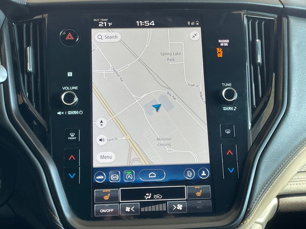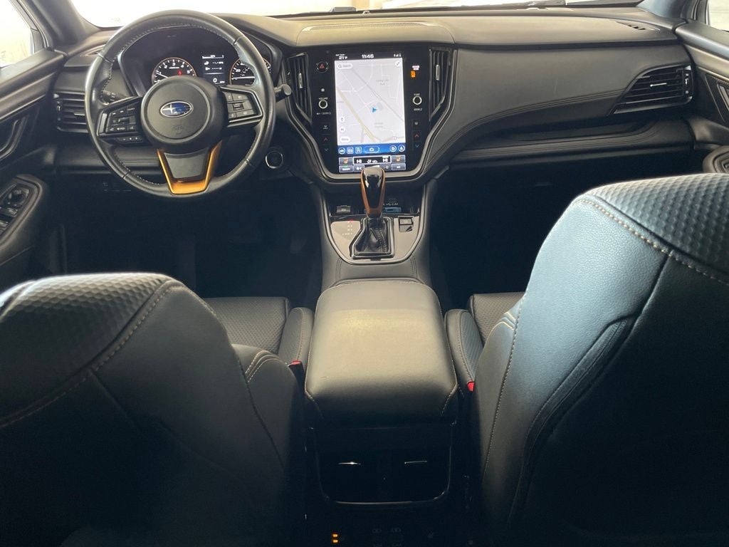 The exterior of this Outback Wilderness exudes an athletic and adventurous spirit, with its distinctive black exterior accents, 17-inch black alloy wheels, and raised suspension for increased ground clearance. Inside, the cabin is thoughtfully designed with premium materials and advanced technology, including a large 11.6-inch STARLINK multimedia navigation system, a power moonroof, and a wireless charging pad for your mobile devices.
