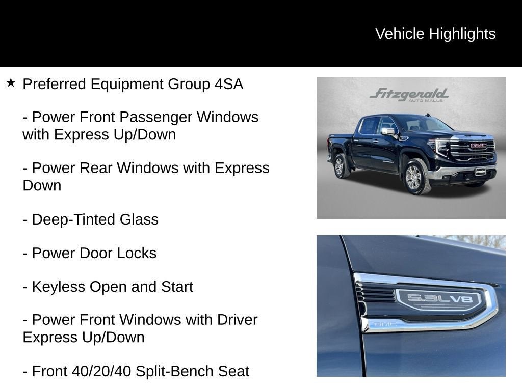 2026 Onyx Black GMC Sierra 1500 10-Speed Automatic 10-Speed Automatic, 4WD, Black Leather, 10-Way Power Driver Seat Adjuster with Lumbar, 10-Way Power Passenger Seat Adjuster with Lumbar, 120-Volt Bed Mounted Power Outlet, 120-Volt Interior Power Outlet, 170 Amp Alternator, 2 Charge/Data USB Ports, 2 Type-C Charge-Only Rear USB Ports, 6-Speaker Audio System Feature, Auto-Locking Rear Differential, Auxiliary External Transmission Oil Cooler, Chrome Header and Chrome Grille Insert Bars, Color-Keyed Carpeting Floor Covering, Deep-Tinted Glass, Driver Memory, Electric Rear-Window Defogger, Front 40/20/40 Split-Bench Seat, Front Frame-Mounted Black Recovery Hooks, Front Rain-Sensing Wipers, HD Rear Vision Camera, Heated Driver and Front Outboard Passenger Seating, Hitch Guidance, Integrated Trailer Brake Controller, Keyless Open and Start, LED Cargo Area Lighting, Manual Tilt-Wheel and Telescoping Steering Column, OnStar Services Capable, Perimeter Lighting, Power Door Locks, Power Front Passenger Windows with Express Up/Down, Power Front Windows with Driver Express Up/Down, Power Rear Windows with Express Down, Preferred Equipment Group 4SA, Push Button Start, Rear Wheelhouse Liners, Remote Vehicle Starter System, SiriusXM with 360L Trial Subscription, Standard Suspension Package, Steering Wheel Audio Controls, Theft Deterrent System (unauthorized Entry), Trailering Package, Wheels: 18 x 8.5 6-Spoke Machined Aluminum, Wi-Fi Hotspot Capable. EcoTec3 5.3L V8 SLT You will love our NO HAGGLE, NO HASSLE PRICING here at Fitzgerald Auto Mall. Ask us about our BUYER PROTECTION PLAN, LOANER CAR PROGRAMS, AND FREE Vehicle History Report. Can not find what you want?? NO PROBLEM! We have over 1,000 Pre-Owned vehicles available at WWW.FITZMALL.COM. You can also visit us in person at 114 Baughmans Lane Frederick MD, 21702 or Call Us @240-629-7301.