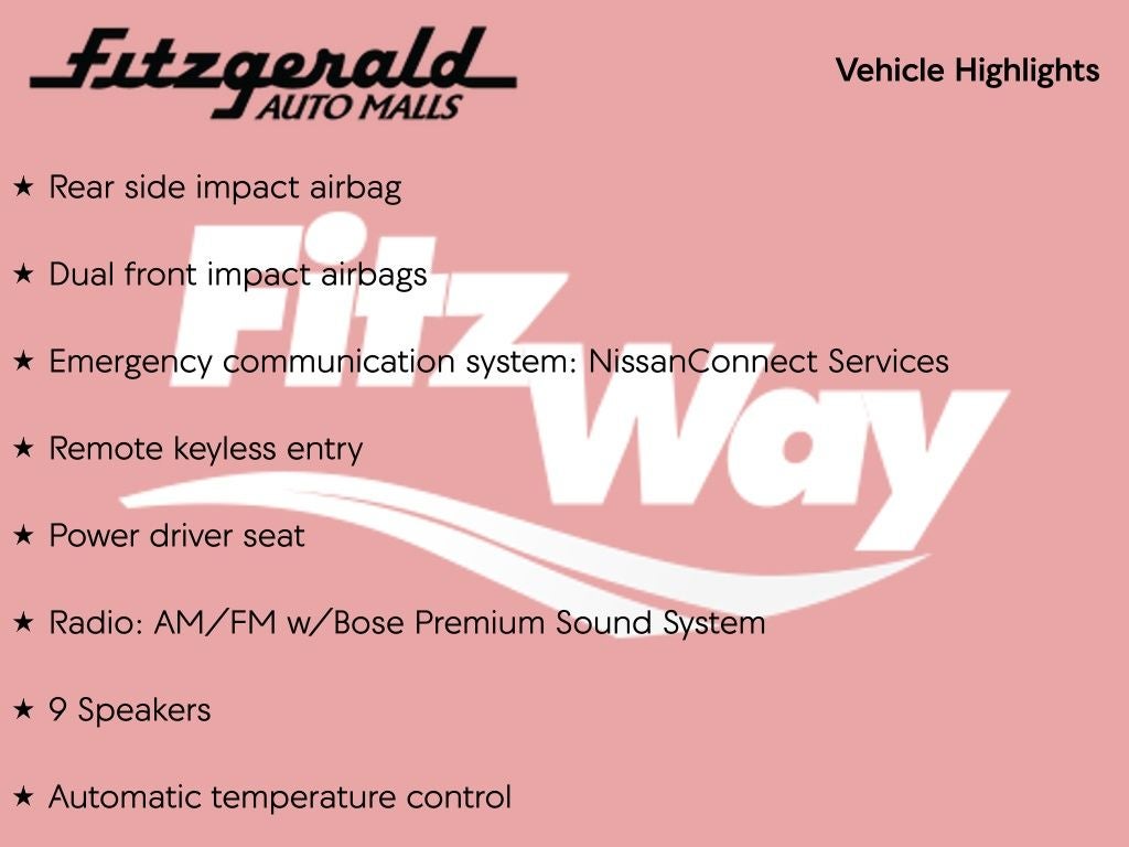 Pearl White Tricoat 2.5 SL AWD CVT with Xtronic 2.5L 4-Cylinder DOHC 16V Navigation, Sunroof / Moonroof, Back Up Camera, Bluetooth®, Clean History Report, a Clean Carfax, CVT with Xtronic, 19 Unique Alloy Wheels, 4-Wheel Disc Brakes, 9 Speakers, ABS brakes, Auto High-beam Headlights, Automatic temperature control, Blind Spot Warning, Body-Colored Splash Guards, Brake assist, Dual front impact airbags, Dual front side impact airbags, Electronic Stability Control, Emergency communication system: NissanConnect Services, Four wheel independent suspension, Front anti-roll bar, Front dual zone A/C, Fully automatic headlights, Heated Front Bucket Seats, Heated steering wheel, Knee airbag, Leather-Appointed Seat Trim, Low tire pressure warning, Navigation System, NissanConnect featuring Apple CarPlay, Occupant sensing airbag, Overhead airbag, Panic alarm, Passenger door bin, Power door mirrors, Power driver seat, Power moonroof, Power passenger seat, Radio: AM/FM w/Bose Premium Sound System, Rear anti-roll bar, Rear Parking Sensors, Rear side impact airbag, Rear window defroster, Remote keyless entry, Security system, Speed control, Speed-sensing steering, Speed-Sensitive Wipers, Telescoping steering wheel, Tilt steering wheel, Traction control, Trunk Organizer Tray, Variably intermittent wipers.